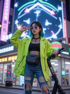 A mid-shot captures an Asian woman standing under a holographic billboard,wearing an asymmetrical cut fluorescent green leather jacket with a black fishnet undershirt. A real-time social data projection hovers over the left shoulder of her jacket. She stands on a shared electric scooter with one foot,holding reflective sunglasses in her right hand and making a "V" sign with her left hand,where AR special effects sparks burst from her fingertips. Rips in her ripped jeans reveal smart temporary tattoos displaying fluctuating heartbeat curves,and a multi-functional fanny pack hangs from her waist,containing a foldable keyboard. The blurred background shows the reflection of a convenience store glass showcasing the 3M reflective strips on her magnetic heel boots,while a swarm of drones above form dynamic arrows to guide direction,and her hair is highlighted with circuit board blue that stands out under the neon lights.,