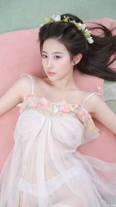 The image is a portrait of a young woman lying on a pink blanket. She is wearing a long, flowing white dress with a pink and white floral design on the bodice and skirt. Her hair is styled in a half-up, half-down hairstyle with a flower crown on top. She has long dark hair and is looking directly at the camera with a serious expression. The background is a light green color, and the overall mood of the image is elegant and romantic.