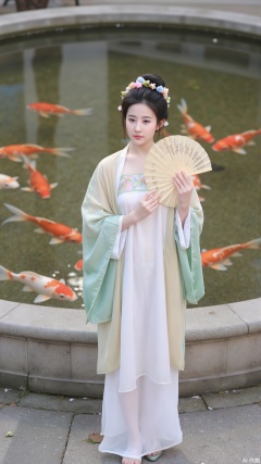 The image shows a young woman wearing a traditional Chinese Hanfu outfit. She is standing in front of a large circular pond with several goldfish swimming in it. The woman is holding a bamboo fan in her right hand and has a flower crown on her head. She has dark hair styled in a bun with pink and blue flowers. The background is blurred, but it appears to be an outdoor setting with a building and a tree visible. The overall mood of the image is peaceful and serene.