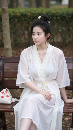 The image shows a young woman sitting on a wooden bench in a park. She is wearing a long, flowing white robe with a high neckline and long sleeves. Her hair is styled in a high bun with a black ribbon tied in a bow at the top. She has a small white bag with red and white polka dots on it next to her. The woman is looking off to the side with a thoughtful expression on her face. The background is blurred, but it appears to be a wooded area with trees and bushes. The overall mood of the image is peaceful and serene.