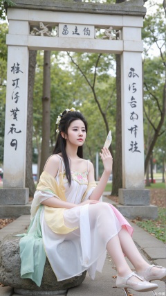 The image shows a young woman dressed in traditional Chinese clothing, sitting on a rock in front of a white archway with Chinese characters written on it. She is wearing a long, flowing white dress with a pink and yellow floral pattern and has long black hair styled in a traditional updo. The woman is holding a small fan in her hand and is looking off to the side with a serious expression on her face. The archway is surrounded by trees and greenery, and there is a stone pathway leading up to it. The overall mood of the image is peaceful and serene.