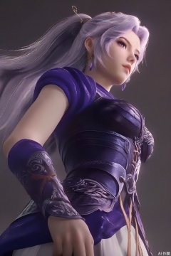 score_9_up,score_8_up,1girl, solo, long hair, dress, jewelry, ponytail, purple hair, earrings, armor, lips, from below,YunXiao