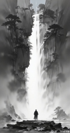 moran,lvjing,baoshi,waterfall, greyscale, 1other, monochrome, ambiguous gender, scenery, outdoors, fog, standing, tree, water, from behind, solo, silhouette, ruins,1