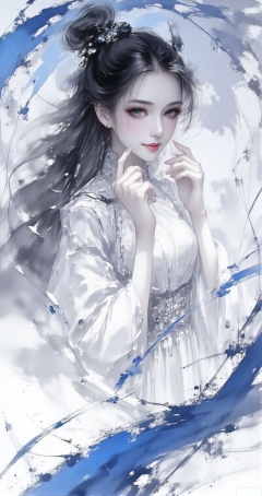 moran,lvjing,baoshi, monochrome, greyscale,1girl,solo,looking at viewer,smile,hair ornament,dress,jewelry,closed mouth,upper body,sky,cloud,white dress,blue sky,hands on the cheeks,,cover,simple background,gradient background,close-up details,outstanding style,adding a touch of dimension to your images without compromising details,close-up