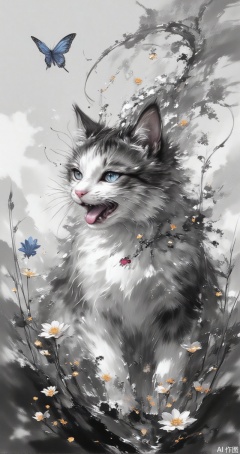 moran,lvjing,baoshi, monochrome, greyscale,sky,clouds,flowers,cat,no humans,flower,tongue,realistic,animal focus,animal,tongue out,looking at viewer,hair flower,open mouth,photorealistic,whiskers,plant,11,cover,simple background,gradient background,close-up details,outstanding style,adding a touch of dimension to your images without compromising details,close-up,flower,butterfly,grass,water,sunlight,sky,