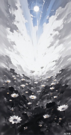 moran,lvjing,baoshi, monochrome, greyscale,sky,clouds,flowers,flower,no humans,sky,field,outdoors,scenery,day,cloud,flower field,blue sky,white flower,sun,grass,blurry,sunlight,daisy,cloudy sky,cover,simple background,gradient background,close-up details,outstanding style,adding a touch of dimension to your images without compromising details,close-up,