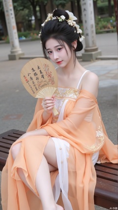 The image shows a young woman dressed in traditional Chinese clothing. She is sitting on a wooden bench with her legs crossed and her hands resting on her knees. The woman is wearing a long orange robe with gold embroidery and a matching headpiece with a floral design. She has long black hair styled in loose curls and is holding a bamboo fan in her right hand. The background is blurred, but it appears to be an outdoor setting with pillars and plants. The overall mood of the image is peaceful and serene.