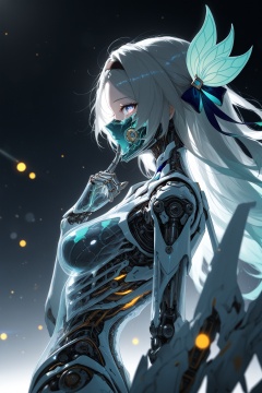 firefly\(honkai: star rail\),masterpiece,best quality,amazing quality,very aesthetic,absurdres,newest,extreme aesthetic,in the style of fashion photography,light particles,cinematic lighting,Visual impact,sharp focus,Emotionalization,depth of field,dutch angle,scenery,1girl,solo,long hair,closed mouth,medium breasts,armor,eyelashes,profile,mask,forehead,science fiction,mouth mask,sideways glance,android,hair slicked back,cyborg,robot joints,mechanical parts,cyberpunk,looking at viewer,upper body,from side,simple background,white background,translucent skin,mechanical structure,finger to mouth,