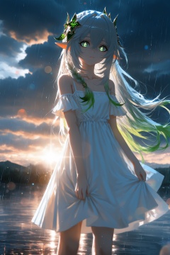 masterpiece,best quality,amazing quality,very aesthetic,absurdres,newest,highres,1girl,solo,long hair,looking at viewer,bangs,hair ornament,dress,hair between eyes,bare shoulders,green eyes,collarbone,braid,grey hair,sidelocks,multicolored hair,outdoors,green hair,sky,alternate costume,pointy ears,cloud,white dress,blurry,symbol-shaped pupils,gradient hair,alternate hairstyle,cloudy sky,rain,hair down,nahida \(genshin impact\),backlighting,blue and white theme,depth of field,cinematic lighting,light particles,lens flare,(artist:quasarcake:0.8),extreme aesthetic,(wlop:0.6),aesthetic,Emotionalization,temperate atmosphere,in the style of fashion photography,(Visual impact:1.2),giving the poster a dynamic and visually striking appearance,impactful picture,colorful,splash of color,movie perspective,