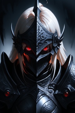 dmsty,masterpiece,best quality,amazing quality,absurdres,newest,ultra-detailed,close-up,upper body portrait,female knight,dark fantasy armor,eerie atmosphere,imposing pauldrons,gothic aesthetic,high contrast,dramatic lighting,deep shadows,battle-worn metal,intricate engravings,mysterious expression,glowing red eyes,cinematic composition,dark environment,moody background,