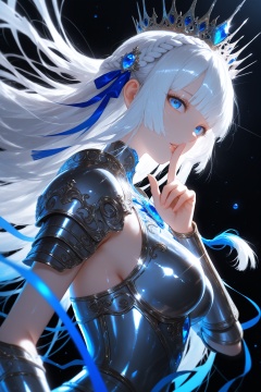 masterpiece,best quality,amazing quality,very aesthetic,absurdres,newest,extreme aesthetic,in the style of fashion photography,light particles,cinematic lighting,Visual impact,sharp focus,Emotionalization,depth of field,dutch angle,scenery,1girl,solo,long_hair,breasts,looking_at_viewer,bangs,blue_eyes,hair_ornament,ribbon,hair_ribbon,upper_body,braid,white_hair,sidelocks,parted_lips,shiny,hand_up,blunt_bangs,armor,from_side,lips,fingernails,eyelashes,floating_hair,blue_ribbon,black_background,shoulder_armor,gem,tassel,light_particles,index_finger_raised,finger_to_mouth,french_braid,pauldrons,breastplate,glint,vambraces,crown_braid,shushing,blue_gemstone,