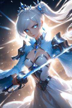 masterpiece,best quality,amazing quality,very aesthetic,absurdres,newest,extreme aesthetic,in the style of fashion photography,light particles,cinematic lighting,Visual impact,sharp focus,Emotionalization,depth of field,dutch angle,scenery,weiss_schnee,1girl,solo,long_hair,breasts,looking_at_viewer,bangs,blue_eyes,hair_ornament,long_sleeves,dress,holding,cleavage,jewelry,medium_breasts,closed_mouth,upper_body,ponytail,weapon,white_hair,earrings,small_breasts,shiny,sword,artist_name,signature,wide_sleeves,necklace,holding_weapon,white_dress,armor,blurry,shiny_hair,side_ponytail,lips,v-shaped_eyebrows,clothing_cutout,eyelashes,floating_hair,blue_dress,glowing,watermark,scar,holding_sword,cleavage_cutout,tiara,shoulder_armor,gem,glowing_eyes,web_address,light_particles,scar_on_face,pendant,backlighting,dual_wielding,high_collar,serious,glint,scar_across_eye,shrug_\(clothing\),blue_gemstone,rapier,left-handed,