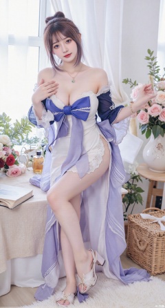 (masterpiece:1.2),best quality,Ultra clear, wallpaper, 8k, masterpiece, 1girl, solo, long hair, breasts, looking at viewer, bangs, large breasts,long dress,, bare shoulders, jewelry, black hair, standing, purple eyes, full body, flower, thighs, indoors, hair bun, long dress, high heels, see-through, book, bare legs, window, table, white footwear, standing on one leg, curtains, pink flower, side slit, vase,(huge breasts:2.99),(full breasts:2.99),(pink rose flowers:1.59),XzhihuaX,Xleidianjiangjun,Xyuenanaodai,XmeiningSMW,XhaiyuejiCosplay,Xyoulingniang,XbachongshenziCOS,XjiaodaiqunDHL,Xshuilian,Xhujiaoer,XshanhugongxinhaiCOS