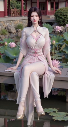 (masterpiece:1.2),best quality,The image is a digital illustration of a young woman sitting on a wooden bench in a pond with lily pads. She is wearing a long dress with design on the chest and sleeves. The dress has a high neckline and short sleeves,Holding a lotus in hand. She has long dark hair styled in loose waves and is wearing gold high heels. The woman is posing with one hand on her hip and the other resting on the edge of the bench. The background is filled with pink and white lotus flowers and green leaves. The overall mood of the image is peaceful and serene,(huge breasts:2.99),(full breasts:2.99),(Background with traditional Chinese architecture, lotus pond and pink lotus flowers:1.39),XhaiyuejiCOS,Xpugongying,XyoulingniangCOS,XleidianjiangjunYF,Xshuilian,XbachongshenziCOS,XmengjianyueruixiCOS,XyunyunXYK,XshengcaierX2
