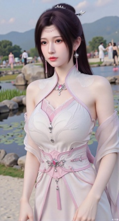 SFW,(masterpiece:1.2),best quality,absurdres,masterpiece,original,extremely detailed wallpaper,perfect lighting,1girl,solo,standing,looking at viewer,(cowboy_shot:1.23),black hair,long hair,long derss,high heels,blurry background,depth of field,motion blur,bare shouders,crystal_earrings,headpiece,hair_tie,chest_jewel,gem,necklace,jewelry,in summer,day,(outdoors,nature,sea:1.29),(Pond, water lilies,rose,beach:1.69),(huge breasts:2.99),(full breasts:2.99),XhaiyuejiCOS,Xpugongying,XyoulingniangCOS,XleidianjiangjunYF,Xshuilian,XbachongshenziCOS,XmengjianyueruixiCOS,XyunyunXYK,XshengcaierX2