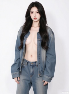 1girl, solo, long hair, breasts, looking at viewer, simple background, black hair, white background, navel, jacket, parted lips, open clothes, pants, open jacket, lips, sleeves past wrists, no bra, denim, realistic, unbuttoned