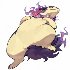 masterpiece,(hisuian typhlosion:1.1),best quality,feral,solo,full body,simple background,pokemon \(creature\),<lora:hisuian typhlosion XL:1>,5 finger,3toes,score_9,score_8_up,score_7_up,from_below,on_back,seductive_smile,