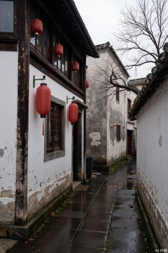 wet alleyway in what appears to be a traditional East Asian town. The architecture is characterized by white-washed walls with dark wooden beams and tiled roofs