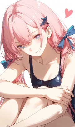 1girl, solo, long hair, breasts, looking at viewer, blush, smile, bangs, blue eyes, simple background, hair ornament, white background, ribbon, hair between eyes, bare shoulders, twintails, sitting, closed mouth, swimsuit, hair ribbon, pink hair, heart, multicolored hair, small breasts, one-piece swimsuit, symbol-shaped pupils, low twintails, heart-shaped pupils, school swimsuit, blue ribbon, knees up, blue one-piece swimsuit, hugging own legs