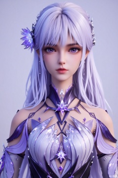 Long, silvery - white hair flows smoothly and gracefully. A delicate blue floral hair accessory is pinned on one side. The purple eyes are bright and expressive, with tiny sequins at the corners adding a touch of agility. The lip color is light and natural. Wears a costume in purple and white color scheme, adorned with numerous geometric cuts and crystal - like decorations. The collar is high - standing, and there is a star - shaped ornament around the neck. There are diamond - shaped cut - outs and purple crystal embellishments at the chest. The black area at the waist is paired with a large star - shaped purple crystal decoration. The overall look is fantastical and gorgeous, as if from a magical world.