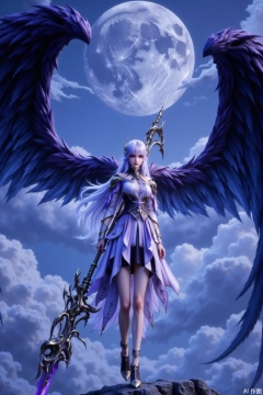 A silver - haired woman with her hair fluttering in the wind. She wears a light - colored battle dress in white and purple, with the skirt edges flowing gracefully. Behind her are a pair of huge black wings, with a faint purple sheen on the edges. She holds a large, intricately - designed blade weapon adorned with dark metal decorations. Her feet step on black sharp claws, surrounded by swirling clouds and mist. The background features a full moon hanging high in the night sky, with moonlight casting down, creating a mysterious and powerful dark magic atmosphere.