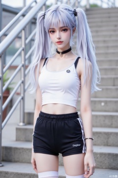Silver - white hair styled in twin tails, adorned with braided hair ties. Wears a white cropped, mid -riff - baring top with thin black straps. Paired with black athletic shorts that have white stripes on the sides. White thigh - high socks cover the legs. A black choker with a small pendant adorns the neck. The background features outdoor steps and metal railings, creating an overall youthful, energetic, and slightly edgy style.