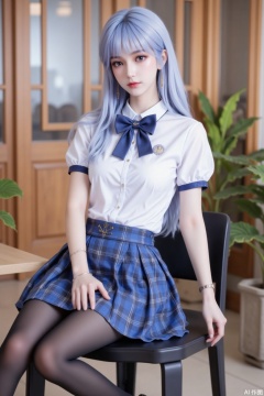 Long, light - blue hair with smooth tips. Wears a white short - sleeved shirt with a large blue plaid bow tie at the collar and a delicate small badge on the left chest. Paired with a blue plaid pleated miniskirt. Black tights cover the legs, and black low - heeled leather shoes are on the feet. Sits on a black chair. The background features indoor wooden doors and green plants, presenting an overall fresh and sweet school - girl style.