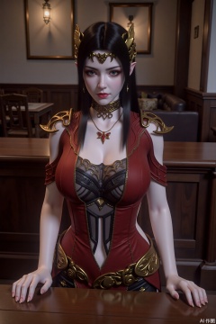 1girl, solo, long hair, breasts, looking at viewer, black hair, dress, jewelry, earrings, pointy ears, red dress, pale skin,Supporting the table with hands,big breasts,cleavage,learning forward,looking_at_viewer,indoor,MDS