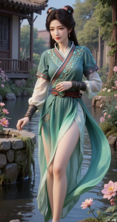 Her top features emerald-green ink-wash patterns, with intricate embroidery adorning the cuffs and neckline, adding an ancient charm. Her skirt is a light ink gradient, fluttering gently as the water ripples, revealing her long, fair legs.