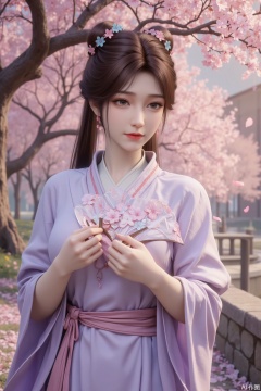 Her light purple kimono is exquisitely designed, with delicate cherry blossom patterns embroidered on the collar and cuffs, as if mimicking the petals scattered around. The fabric is light and soft, swaying gently with the breeze, as if harmonizing with the surrounding cherry blossoms. A thin pink silk ribbon is tied around her waist, its ends fluttering in the wind, adding a touch of ethereal beauty.