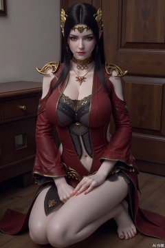 1girl, solo, long hair, huge breasts, looking at viewer, black hair, dress, jewelry, earrings, pointy ears, red dress, armor ,kneeling,all fours,looking_at_viewer,indoor,MDS,soft breasts,large natural breast