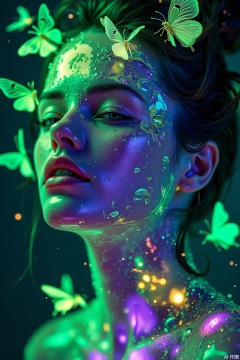 Surrealism portrait of a woman with glass-like skin, fluorescent butterfly swarms flowing in her veins. Style: biopunk. Light: UV backlight, pulsing cold light. Materials: glass-like skin, luminous scale powder. Rendering: translucent refraction. Colors: fluorescent green, iris purple. Composition: radiative composition. Perspective: macro close-up.,surrealism