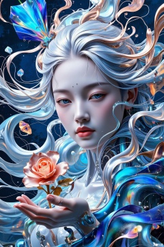 Surrealism portrait of a silver-haired girl floating mid-air, a liquid metal rose blooming in her palm. Style: cyber fantasy. Light: neon refracted light, cool holographic aura. Materials: liquid metal, icy crystal prisms. Rendering: neon chromatic dispersion. Colors: cobalt blue fluorescence, rose gold. Composition: diagonal dynamics. Perspective: surrounding close-up.,surrealism,Oriental Aesthetics
