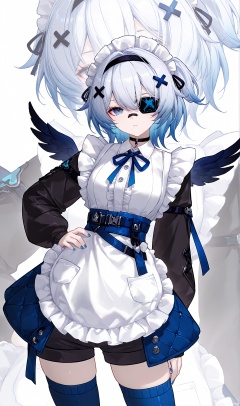 1girl, solo, breasts, looking at viewer, short hair, bangs, blue eyes, shirt, hair ornament, thighhighs, long sleeves, ribbon, closed mouth, blue hair, jacket, white hair, multicolored hair, cowboy shot, hairband, frills, open clothes, wings, shorts, choker, puffy sleeves, virtual youtuber, nail polish, apron, open jacket, black jacket, hand on hip, maid, maid headdress, neck ribbon, black choker, eyepatch, black hairband, blue ribbon, white apron, bandaid, maid apron, blue nails, frilled apron, zoom layer, blue thighhighs