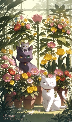 create an image of a cartoon black cat with a flower on head., open mouth, green eyes, english text, signature, animal focus, flower, plant, no humans, yellow flower, artist name, animal, animal ear fluff, closed eyes, pink eyes, animal ears, cat, looking at viewer, kitten, grey cat, yellow eyes, cactus, vines, fangs, heterochromia, white cat, grass, red flower, cat ears, purple cat, pink flower, closed mouth, smile, pink cat, leaf, blush stickers