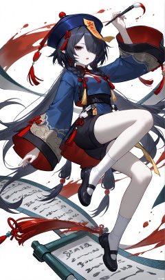 1girl, solo, long hair, looking at viewer, open mouth, simple background, black hair, long sleeves, hat, white background, holding, very long hair, full body, braid, shorts, pointy ears, wide sleeves, hair over one eye, black eyes, pale skin, blue headwear, paintbrush, scroll, jiangshi, calligraphy brush, talisman, holding paintbrush, holding brush