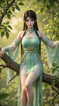1 girl, solo, long hair, looking at the viewer, brown hair, black hair, hair accessories, dress, brown eyes, Chinese clothes, stretched out arms, green dress, sitting on the branches, putting legs on the branches, lush leaves, sunlight spills through the gaps of the leaves, making him look particularly charming