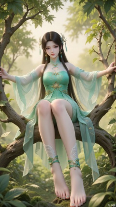1 girl, solo, long hair, looking at the viewer, brown hair, black hair, hair accessories, dress, brown eyes, Chinese clothes, stretched out arms, green dress, sitting on the branches, putting legs on the branches, lush leaves, sunlight spills through the gaps of the leaves, making him look particularly charming