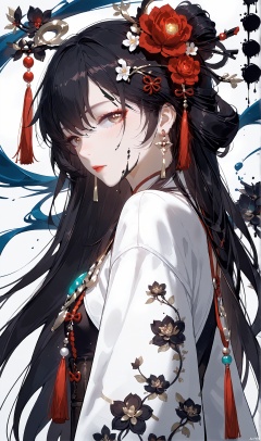 Ancient Art Style, Ink Painting, Traditional Chinese Painting, (Ink Style1:4), (Splash Ink Painting), 1girl, solo, long hair, looking at viewer, blush, bangs, black hair, hair ornament, white background, brown eyes, jewelry, closed mouth, upper body, flower, earrings, hair flower, from side, lips, bird, chinese clothes, tassel,(Ink style),Hazy, xinyue,the whole body,Flowing hair, chinese Landscape painting