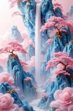 qinghua,qinghua A digital artwork featuring a serene, ethereal landscape with a cascading waterfall flowing down rugged, blue rock formations. Pink cherry blossom trees and soft pink clouds add a dreamy, pastel aesthetic. The image is highly detailed with a surreal, almost 3D effect, blending natural and fantastical elements.