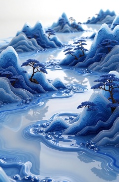 qinghua,qinghua A highly detailed CGI artwork depicting a surreal, abstract landscape with undulating blue waves and smooth, reflective surfaces. Jagged, mountain-**** formations rise from the water, adorned with sparse, stylized trees. The scene is bathed in soft, diffused light, creating a dreamlike, almost otherworldly atmosphere. The overall color palette is dominated by various shades of blue and white.