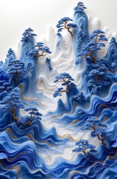 qinghua,qinghua A highly detailed, digital artwork featuring a surreal, abstract landscape with undulating, wave-**** white and blue forms resembling mountains and trees. The blue hues dominate, with intricate, swirling patterns and gold accents. The style is reminiscent of traditional Chinese art, blending natural elements with fluid, organic shapes.