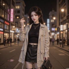 The top light is the main light source, illuminating from a 45-degree angle directly above, highlighting the three-dimensional contour of the face and forming highlights on the bridge of the nose and cheekbones. The background light is warm yellow city lights, creating a night urban atmosphere. The overall light is hard, enhancing the cool temperament of the royal sister, and forming a strong contrast between light and dark on her face.