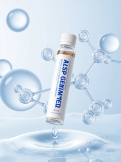 The screen displays a transparent bottle of fish gelatin protein tripeptide beverage, with product names such as "Airway Cake Flavor" and "Fish gelatin protein tripeptide beverage" labeled on the bottle body, as well as "Fermentation" process and specification information of "Net Content: 25mL". The blue text on the transparent bottle is particularly eye-catching, and the small amount of liquid remaining at the bottom of the bottle presents a dynamic dripping effect. The product is surrounded by a transparent molecular structure model, with a soft light blue background adorned with bubble elements, creating a visual effect of the integration of technology and nature as a whole. Through the scientific decoration of molecular models, special labeling of fermentation processes, and dynamic liquid display, the healthy properties of this functional beverage rich in fish gelatin tripeptides are perfectly presented