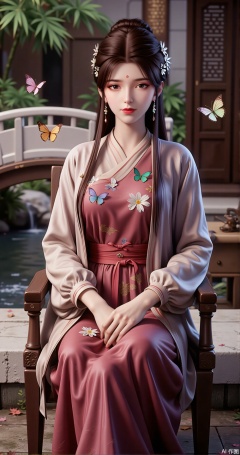 In a classical Chinese courtyard, a woman sits gracefully on a redwood chair. She wears a red Hanfu gown, embroidered with golden clouds and colorful butterflies, featuring shades of pink, orange, lavender, and emerald green, each butterfly lifelike. The hem of her dress sways gently with her movements.