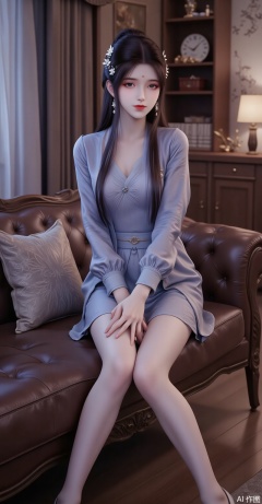 The image shows a young woman sitting on a brown leather couch in a living room She is wearing a blue dress with a high neckline and long sleeves She has long dark hair styled in loose waves and is wearing blue high heels The woman is sitting with her legs crossed and her hands resting on her knees