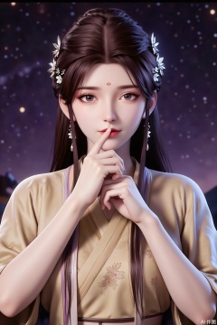 Her right hand rises, her index finger pointing straight at the middle of her mouth, as if signaling a secret or a mysterious message. Her fingers are slender and long, her nails neatly trimmed and clean, exuding an elegant charm. Her arm lines are smooth, her movements natural, revealing a calm and confident demeanor.