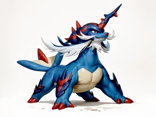 masterpiece,best quality,samurott,feral,solo,full body,pokemon \(creature\),simple background,score_9,score_8_up,score_7_up,<lora:samurott pony:1>,solo horn, white facial hair,3 claws, 2 toes,