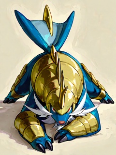 masterpiece,best quality,samurott,feral,solo,full body,pokemon \(creature\),simple background,score_9,score_8_up,score_7_up,<lora:samurott pony:1>,solo horn,white facial hair,3 claws,2 toes,Sharp yellow horn on head,Three claws on each front foot,Yellow shell-like armor around front claws,Yellow shell-like part on tail end,on stomach,