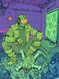 A mechanic with augmented arms covered in grease stains repairs a malfunctioning drone in a cluttered garage filled with flickering holographic schematics. The scene uses sharp angular lines and color blocks of lime green, deep purple, and corroded copper.